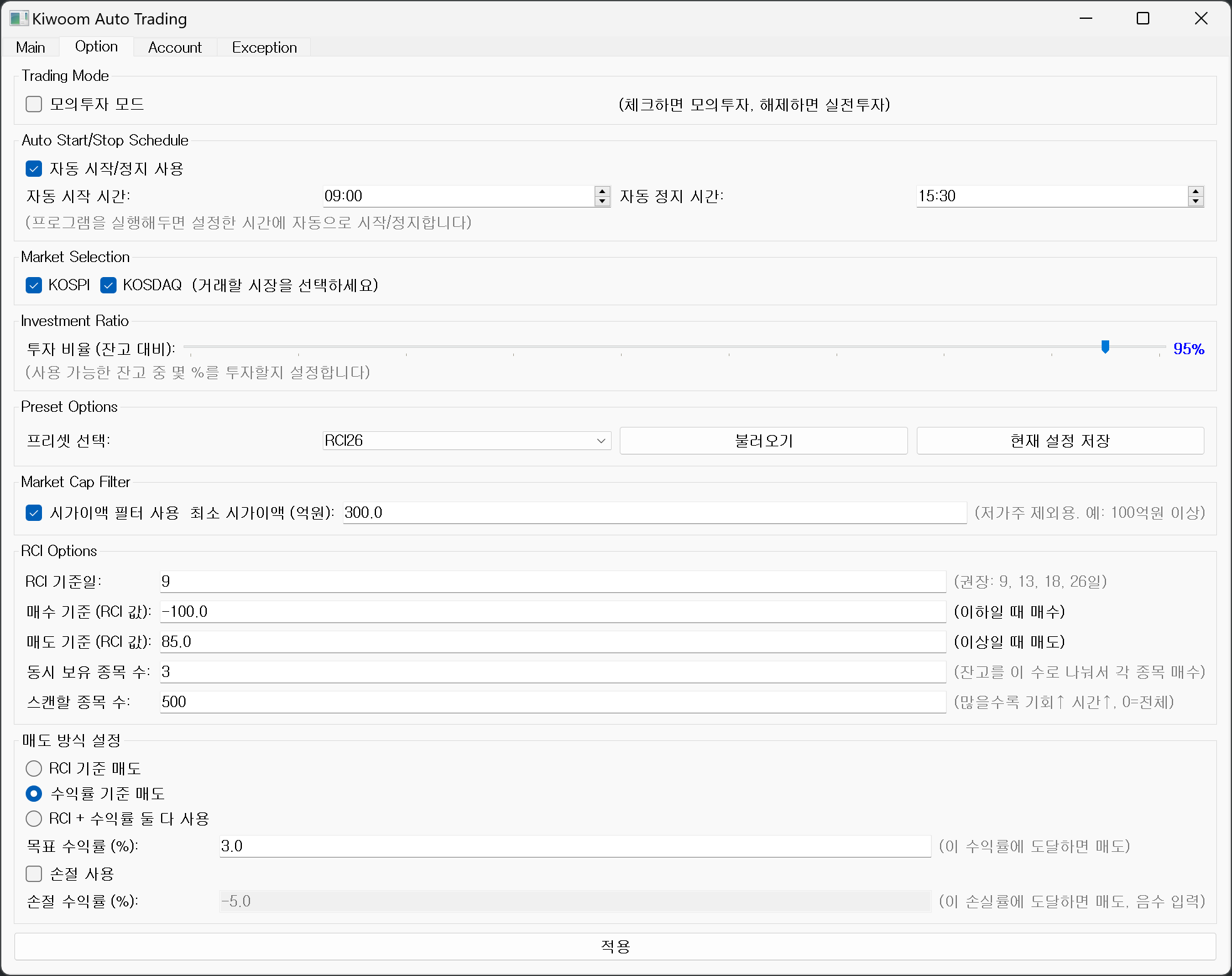 그리고 매도할때 기준, 손절 기준 등 셋팅이 가능합니다.