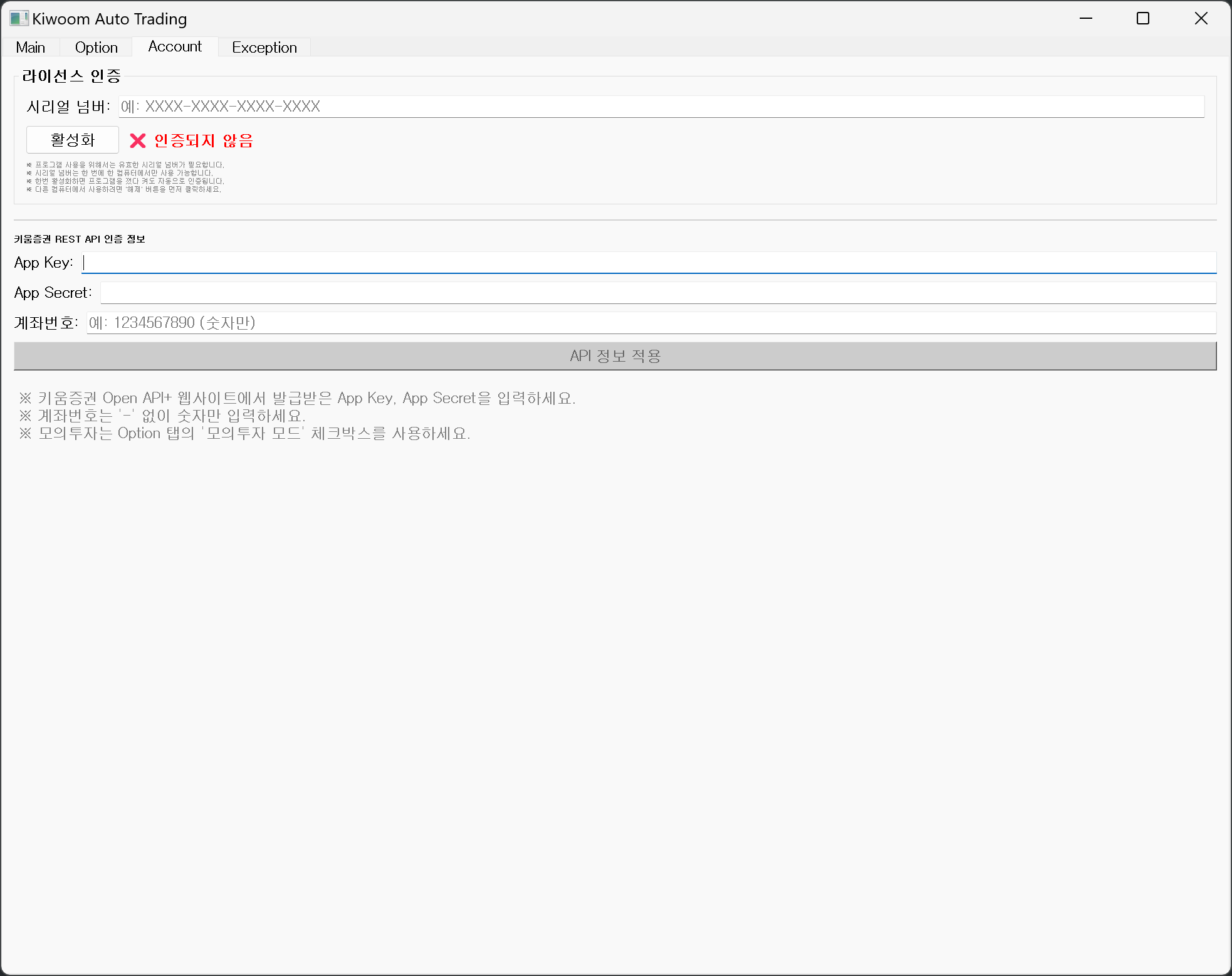 키움 Open API 에 가입을 하고 Key를 받아서 정보를 입력하고 거래가 이루어질수 있는 계좌를 넣습니다.